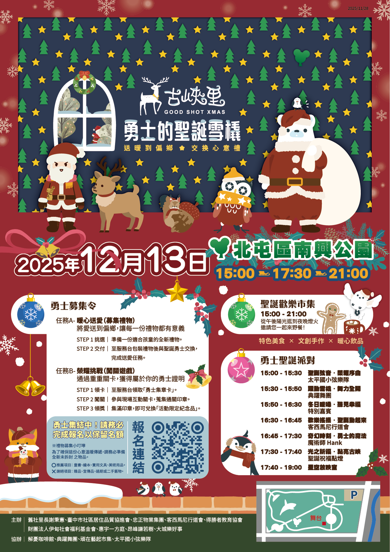 - 家長可提前跟小朋友挑選購買想要送給偏鄉孩童的聖誕禮物,例如:童書,文具,繪本,美術用品等等,並且於活動當天帶著禮物到活動現場。捐贈全新且未拆封使用禮物(請勿捐贈品,過期物品)讓每位孩子能夠暖心過聖誕